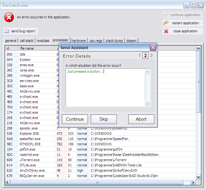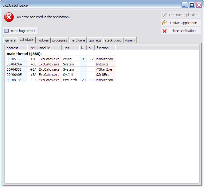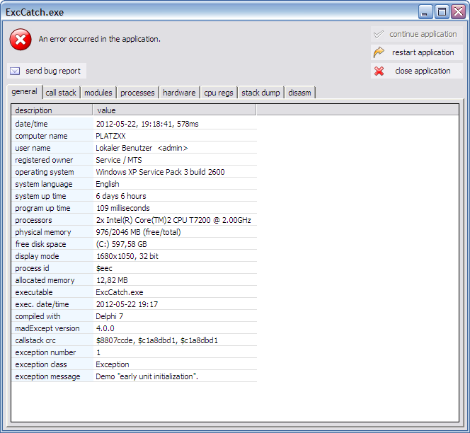 This screenshot shows how the madExcept exception window looks