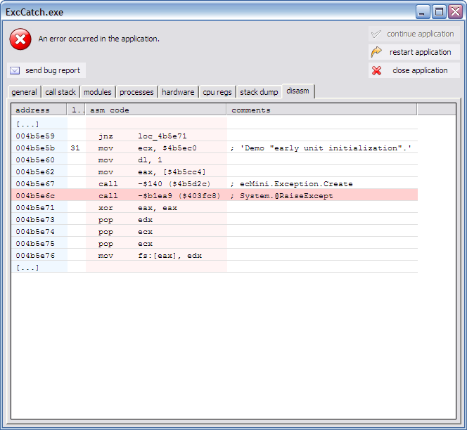 The disasm tab of the exception window.